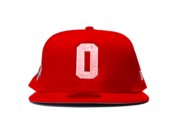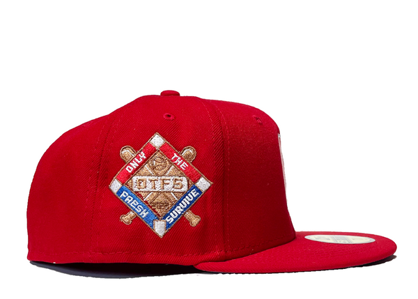 ONLY THE FRESH SURVIVE 59FIFTY RED w. PEPPERMINT PINK "O" LOGO GREY UNDERVISOR